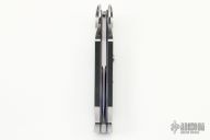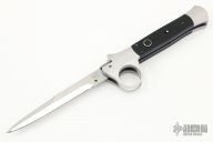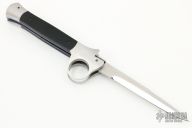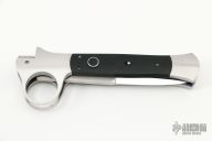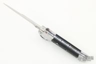 This Picklock by Burn Knives features a mirror polished bayonet style blade with false top edge, .190" stock. The handle has stainless steel bolsters, front and rear, black G-10 scales with black G-10 push button, anodized titanium liners, fileworked stainless steel backspacer. Has a few light scratches, otherwise excellent condition.