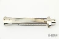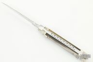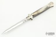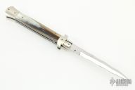 This Auto by Burn Knives features a mirror polished Kris blade with false top edge. The handle has nickel silver bolsters, front and rear, blonde horn scales, stainless steel liners and fileworked backspacer. Picklock release.  Has a square push button. Perfect function. Excellent condition.