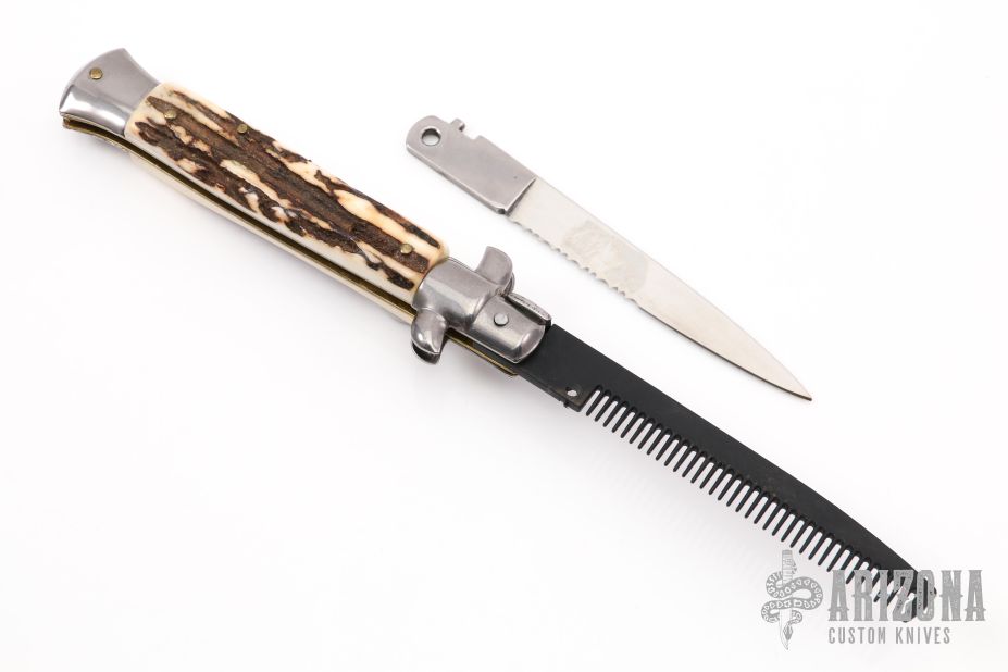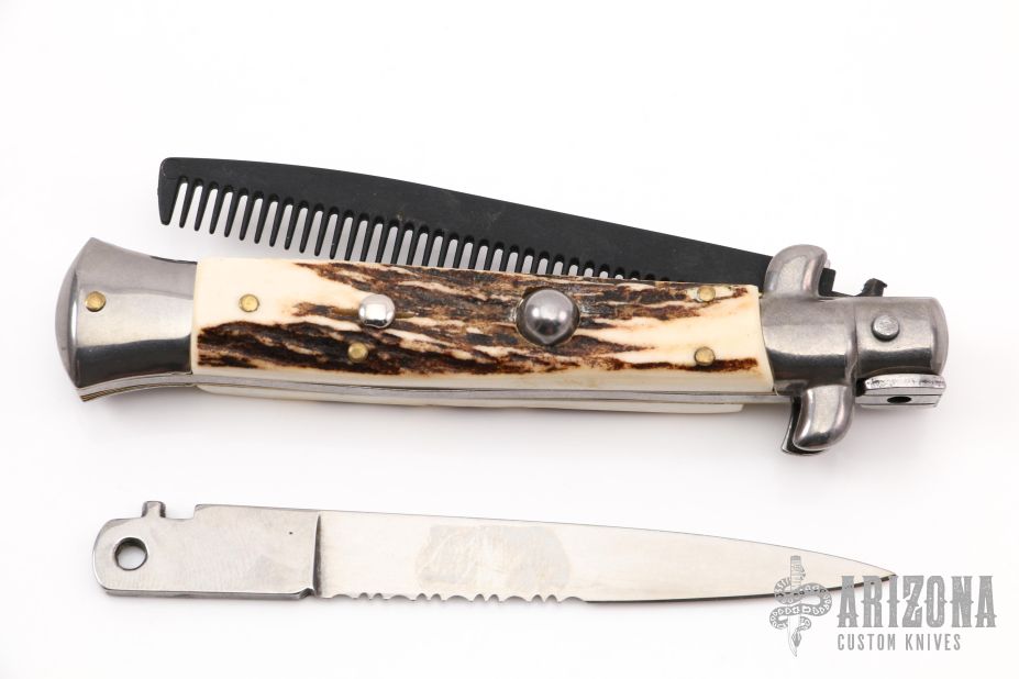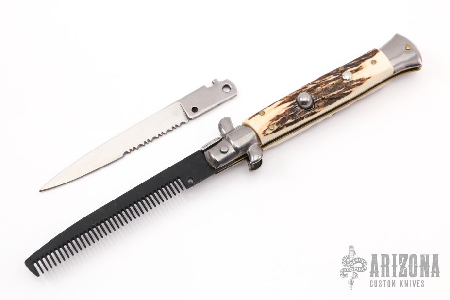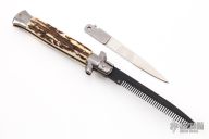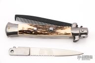 This Swivel Bolster from Stiletto Italy features a partially serrated blade and a comb blade. The handle is comprised of stainless steel bolsters and pommel with stag scales over brass liners and stainless steel backspacer. Excellent condition. This knife hasn't been completely assembled yet. The pin that goes through the pivot has not been peened down so that the blades can be interchanged. The final user can peen it down if they wish.