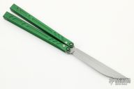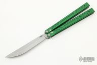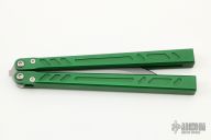 This channel construction, zen pin balisong is available in both a non-live and live blade. This product is on bushings.