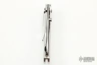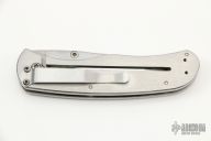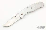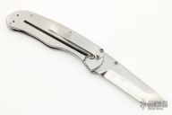 This rare framelock folder by Phill Hartsfield features a satin finished, chisel ground blade. Frame is satin finished stainless steel. Pocket clip is tip up or down reversible. Blade is centered when closed, smooth action, and nice detent and solid lockup. This is a rare piece by Mr. Hartsfield. Has some light scratches, otherwise excellent condition.