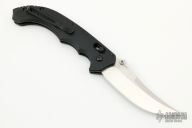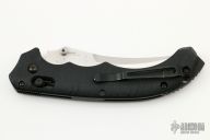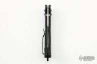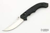 This 860 Bedlam from Benchmade features a satin finish trailing point blade with swedge, dual thumb studs and notched thumb rest. The handle is comprised of textured black G10 scales over black coated steel liners and steel backspacer with lanyard hole and glass breaker. Black coated tip up pocket clip can be mounted for right or left hand carry. The pocket clip shows light wear otherwise the knife is in Excellent Condition.