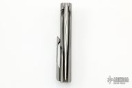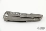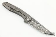 This Switch KM by Tuff Knives features a Chad Nichols Low Level Damascus tanto .225" thick blade with notched flipper. The handle has a tumbled and milled titanium frame with matching tip up clip and backspacer. Excellent fit and finish. Dead center blade seating, smooth action and nice detent. Includes C.O.A. and zipper case. Excellent Condition.
