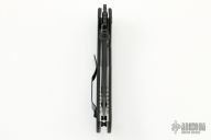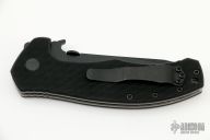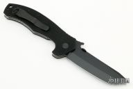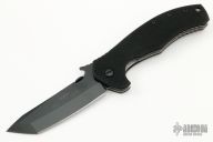This Roadhouse by Emerson Knives has a black tanto blade with a thumbdisc and wave feature. The handle has textured black G-10 scales, titanium liners, black barrel spacers and a tip up black stainless steel clip. S/N 1373. Excellent condition.