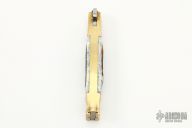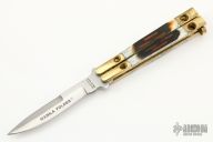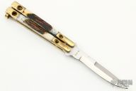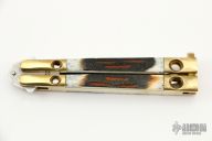 This Manilla Folder Balisong from Taylor/Seto features a satin finished spear point blade with a sharpened top edge. The handle has an integral brass construction with bone inlays. T latch on pommel. Has some scratches, otherwise excellent condition.