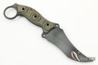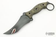 This Triceratops by the Busse features a Shark cerakoted blade with sharpened top edge, .207" blade stock, 1.785" blade depth, full tang construction with black/green G-10 scales and a lanyard hole. New from maker.