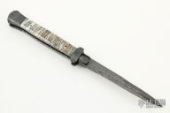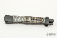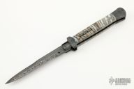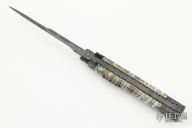 This Picklock by Burn Knives features a Damascus bayonet style blade with false top edge, .210" stock. The handle has Damascus bolsters, front and rear, mammoth ivory scales with fileworked Damascus push button, fileworked Damascus backspace and anodized fileworked titanium liners. Excellent condition. Nice lockup, blade seating and action.