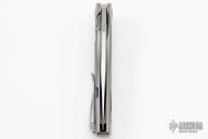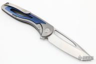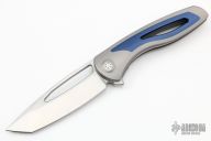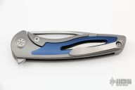 This Apex Flipper from Brian Nadeau features a satin finished blade with a thumbhole, flipper and notched thumbrest. The handle is comprised of a gray titanium frame with blue aluminum inlays, satin titanium tip up clip. Rides on bearings, nice detent, lockup and blade seating, stainless lockface insert. Comes with original box and papers. New from maker.