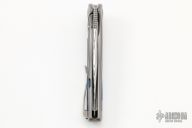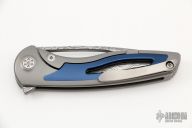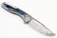 This Apex Flipper from Brian Nadeau features a Damasteel blade with a thumbhole, flipper and notched thumbrest. The handle is comprised of a grey titanium frame with blue aluminum inlays, satin titanium tip up clip. Rides on bearings, nice detent, lockup and blade seating, stainless lockface insert. Comes with original box and papers. New from maker.