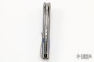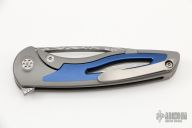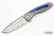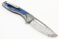 This Apex Flipper from Brian Nadeau features a Damasteel blade with a thumbhole, flipper and notched thumbrest. The handle is comprised of a grey titanium frame with blue aluminum inlays, satin titanium tip up clip. Rides on bearings, nice detent, lockup and blade seating, stainless lockface insert. Comes with original box and papers. New from maker.