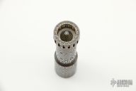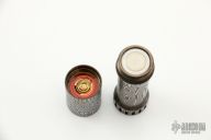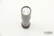 This Damascus flashlight from Tain Fashlights features an acid etch Damascus body with blue and orange tritium in the tail cap (17X). Has some light scuffs and scratches, otherwise Excellent condition.