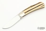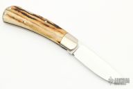 This lockback by Moore (Please let us know if you know which Moore this is) features a mirror polished blade. The handle has dovetailed nickel silver bolsters, stag scales, nickel silver liners, steel and yellow paper micarta backspacers. Nice lockup and blade seating. Has a few light scratches, otherwise excellent condition.