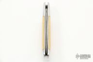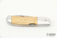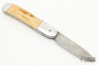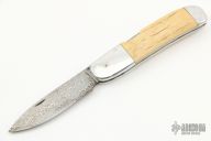 This slipjoint features a Damascus blade with nail nick. The handle has an aluminum frame with mammoth ivory inlays. Has some scratches and patina, otherwise good condition.