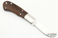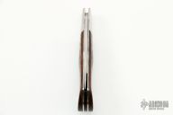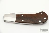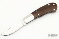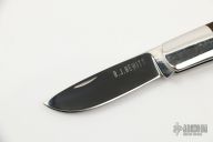This lockback by RJ Hewitt features a mirror polished blade with nail nick. The handle has dovetailed nickel silver bolsters, walnut scales, nickel silver liners, stainless steel backspacer. #310 on the blade. Has some scratches, otherwise good condition.