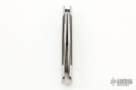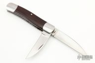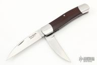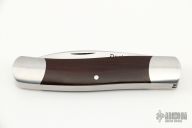 This Slipjoint by Dwayne Dushane features two hand rub satin finished blades with nail nicks. The handle has dovetailed stainless steel bolsters with integral liners, maroon linen micarta covers, stainles steel springs. Has half-stops, flush in all positions. Has some scratches and a little stain on the ricasso, otherwise good condition.