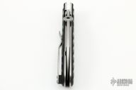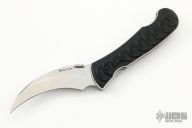 This Elvia Folder by Korth Cutlery features a stonewashed hawkbill blade with thumbdisc. The handle has black G-10 scales and backspacer, orange peel finished titanium liners and a tip up titanium clip. Comes with a velcro case. Rides on IKBS, nice detent, lockup and blade seating. Excellent condition.