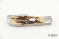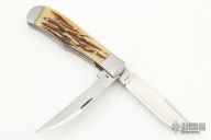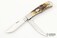 This Two-Blade Trapper by John Howser features hand rubbed satin finish blades in clip-point and wharncliffe styles with nail nicks. The handle has stainless steel liners with satin finish integral double bolsters, and jigged bone covers, stainless steel acorn escutcheon. Has some scratches, otherwise good condition.
