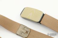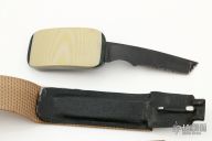 Tan nylon belt with buckle knife by Daniel Valois. Blade slides into concealed kydex sheath and is curved to follow the contour of the waist. The handle is black and yellow micarta. Has some scratches on the blade, otherwise good condition. 42” belt. This is part of the last of the Daniel Valois Estate.
