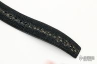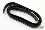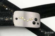 Black Leather belt with stingray skin overlay and buckle knife by Daniel Valois. Blade slides into concealed kydex sheath and is curved to follow the contour of the waist. This one has a titanium blade. The handle is titanium with stingray motif overlays. Has some scratches on the blade and handle, otherwise good condition. 40” belt. This is part of the last of the Daniel Valois Estate.