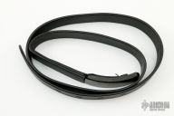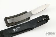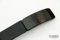 Black Leather belt with buckle knife by Daniel Valois. Blade slides into concealed kydex sheath and is curved to follow the contour of the waist. The handle is dymondwood. Has some scratches on the blade, otherwise excellent condition. 45” belt. This is part of the last of the Daniel Valois Estate.