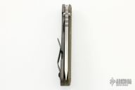This SNG framelock folder by Mick Strider features a stonewashed tanto blade and a dimple pattern green G-10 and flamed titanium frame and tip up titanium clip. Includes a "Lock Bar Stabilizer" for maximum reverse lock retention. Nice detent, lockup and blade seating. New from maker at the 2022 USN Gathering.