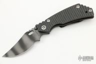 This PT Persian by Mick Strider features a tiger striped blade with notched thumbrest and thumbhole. The handle has a flame finished titanium frame with matching tip up clip. New from maker at the 2022 USN Gathering.