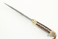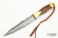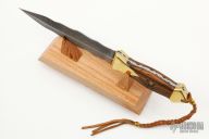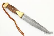 This Dagger by DV Customs features a double-edged Damascus blade with a full tang construction .162" Blade Stock, 1.479" Blade Depth.  The handle has brass bolsters front and rear, bocote wood scales, fully fileworked tang.  Including a wood stand.  S/N 176.  New from maker. Comes with COA.