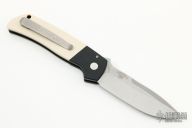 This ATCF Auto by Pro-Tech features a stonewashed Magnacut blade with notched thumbrest. The handle has a black aluminum frame with ivory paper micarta scales, tip up milled titanium clip with hidden screws. Comes with original box and papers. New from maker.