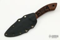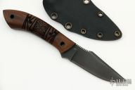 Jason Knight Design by Winkler Knives. Black blade with notched thumbrest, .162" blade stock and .977" blade depth, full tang construction. The handle has tibal pattern walnut scales. Comes with original box, sheath and papers. Excellent condition.