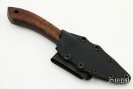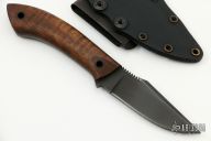Jason Knight Design by Winkler Knives. Black blade with notched thumbrest, .162" blade stock and .977" blade depth, full tang construction. The handle has maple scales. Comes with original box, sheath and papers. Excellent condition.