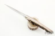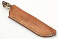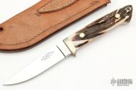 This R.W. Loveless design hunter by Beretta features a polished drop point blade with 0.191" blade stock and 0.886" blade depth. The handle has a nickel silver guard and stag scales over full tapered tang construction. Lanyard tube in pommel. Comes with leather sheath. Light patina is visible on the guard other wise the knife is in Excellent Condition.