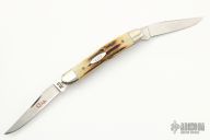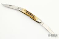 This Muskrat folder by Case Knives features two satin finish blades, sterling silver bolsters and cap, and stag covers, brass liners and stainless springs. Has scuffs and scratches, great condition otherwise.