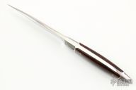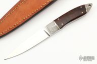 This knife by Koji Hara features a mirror polished blade with an integral full tang construction. The handle features milled front/rear bolsters and desert ironwood scales. Includes a brown leather sheath. Excellent Condition.