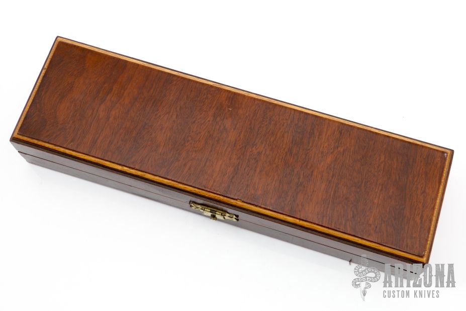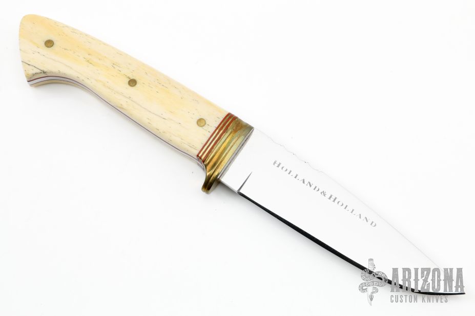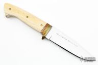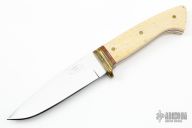 This fixed blade from Stephen Mackrill features a mirror polished drop point blade with fileworked thumbrest, .140" blade stock and 1.237" blade depth, full tang construction. The handle has a brass guard with red and brass spacers, bone scales with red liners. Comes with wooden display box.  Excellent Condition.