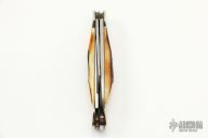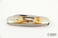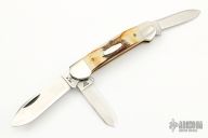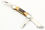 This 3-Blade Canoe by Case Knives features a drop point blade with swedge and nail nick, a 2" clip point blade with swedge and nail nick and a 1.75" wharncliffe style blade with swedge and nail nick. The handle is comprised of nickel silver double bolsters and escutcheon with antique stag covers over brass liners and steel back springs. All springs are flush in the closed, half stop and open positions. Has some scuffs and scratches, great condition.