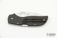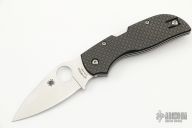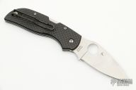This knife by Spyderco features a satin finished drop point blade with a thumbhole and notched thumbramp.  The handle features steel liners/backspacer, a black tip up pocket clip and carbon fiber scales.  Includes the original box and papers.  Excellent Condition.