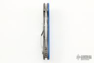 This Domino Flipper has a satin finished stainless steel drop/spear point blade with thumbhole and notched thumbrest. Handle is stonewashed titanium with A-side blue G-10 overlay, 4-way reversible black stainless steel clip, and lanyard tube pin. Action is extremely responsive with great lockup. Excellent condition.