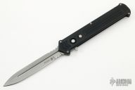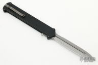 This Prototype Militia Cupid OTF automatic by Rob Dalton features a bead blasted double-edged blade with partially serrated edges. The handle has a black milled aluminum frame with a tip down titanium clip. Fires via push button and retracts by holding the button and moving the slider on the side of the knife. Sliding safety button. Very strong coil spring action. Numbered 00143. Excellent condition.