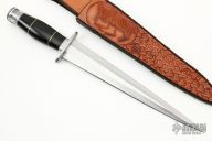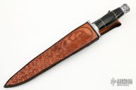 This Arkansas Toothpick by Impact Cutlery features a satin finished double edged blade with .218" blade stock and 1.686" blade depth, hidden tang construction. The handle has an engraved stainless steel guard and butt, buffalo horn grip with fileworked brass spacers. Comes with a hand tooled brown leather sheath. Knife engraved by Ray Negron with a Troy Horse theme. New from maker.