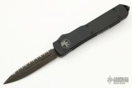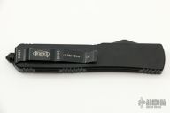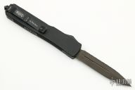 This Ultratech OTF automatic by Microtech features a D/E black blade with a serrated edge. Black aluminum frame with black hardware and tip down stainless steel clip. Dated 01/2007 and s/n 01287. Includes original box, sheath, and papers. Has a couple marks on the clip otherwise excellent condition.