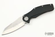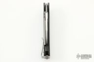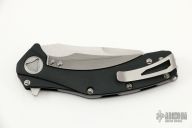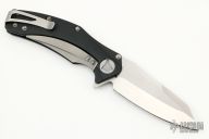 This Mini Matrix flipper by Microtech features a satin finished blade with a notched thumbrest and flipper. The handle has a black aluminum frame with an anodized aluminum backspacer. Comes with nylon sheath and original box and papers. Nice detent, lockup and blade seating. #00496 and dated 03/2013. Excellent condition.