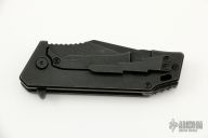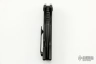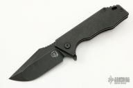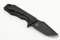 This Mini J-Cape from Something Obscene Company features a black tumbled blade with notched thumbbrest and flipper tab. The handle has a black tumbled titanium frame with matching titanium clip and backspacer. Comes with original box and COA. Has a scratch on the pivot, otherwise excellent condition.