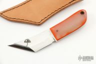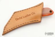 This Micro Samurai by Rainy Day Knives features a hand rub satin finished blade with .159" blade stock and .883" blade depth, full tang construction. The handle has translucent G-10 scales with orange G-10 liners. Includes leather sheath. Has some scratches, otherwise good condition.