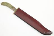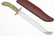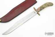 This Bowie by A. Daniel Valois features a cable Damascus blade with .125" blade stock and 1.334" blade depth, hidden/frame tang construction. The handle has a brass guard and frame with stone scales. Coems with a brown leather sheath. Has some scratches and patina, otheriwse good condition. This is one of the last pieces from Daniel Valois's estate.