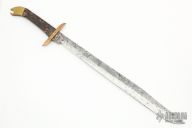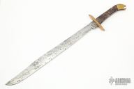 This Long Bowie by A. Daniel Valois features a cable Damascus blade with .221" blade stock and 1.366" blade depth, full tapered tang construction. The handle has a brass guard and rear bolsters, stone scales. Has some scratches and patina, otheriwse good condition. This is one of the last pieces from Daniel Valois's estate.