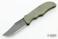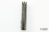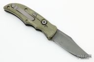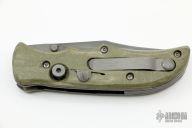 This Prototype Auto by A. Daniel Valois features a bead blasted chisel ground blade with fuller. The handle has "Gator Hyde" rubber scales over titanium liners, steel backspacer. Has a Valois Flush Mount Pocket Clip. Some scratches on blade and frame, otherwise good condition. This is one of the last pieces from Daniel Valois's Estate.