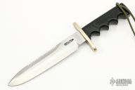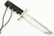 The Model 14-7.5 by Randall Made Knives features satin finished blade with sawteeth, .218" blade stock and 1.370" blade depth, full tang construction. The handle has a double nickel silver guard, and black linen micarta grip with a lanyard hole. Excellent condition.