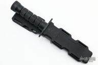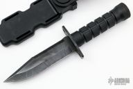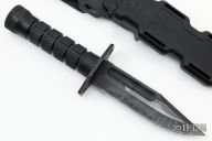 This C.U.K. by Phrobis features a black blade with sawteeth on the spine and a large fuller, .199" blade stock and 1.272" blade depth, hidden tang construction. The handle has a black steel guard and black zytel grip. Comes with original black zytel sheath. Has some scratches, has been used, otherwise good condition. This knife is sterile and has no markings. Used by Seal Teams in Desert Storm. Less than 500 made.