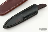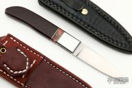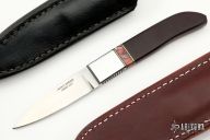 This Integral Loveless Stiff Horn by Alan C Warren features a hand rub satin finished spear point blade with a notched thumb and finger rest, .150" blade stock and .833" blade depth, hidden tang construction. The handle has an integral stainless steel guard with a maroon canvas micarta grip with black/brass/mammoth tooth spacers. Comes with a black leather sheath with boot clip and a brown leather sheath with magnet loop. Excellent condition. Comes with a zippered case.