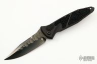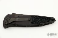 This Socom Elite Auto by Marfione Custom Knives and Borka Blades features a two-tone DLC stonewashed Borka pattern tanto blade with false top edge and notched thumbrest. The handle has a black aluminum frame with stingray skin inlays, DLC stainless steel hardware and tip down clip. Dated 01/2019 and #006. Nice action, lockup and blade seating. Comes with original box, zippered case and COA. Excellent condition.